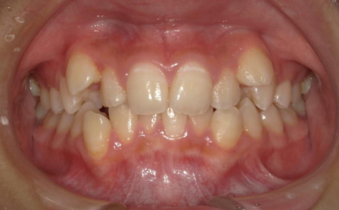 「前歯が大きくねじれている」「歯と歯が重なっていて、ほとんど隙間がない」といった、強いデコボコがあるケースです。 この場合、前歯だけを少し動かすだけではきれいに収まらず、奥歯を含めて歯列全体を広げたり、場合によっては抜歯でスペースを作ったりする必要が出てきます。無理に部分矯正だけでまとめようとすると、仕上がりが中途半端になったり、後戻りしやすくなったりするため、最初から全体矯正を前提に考えたほうが安心です。