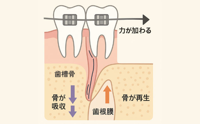 力が加わると、歯根膜が縮む側では骨が溶ける細胞(吸収)が働き、歯が動く方向に骨が吸収されます。